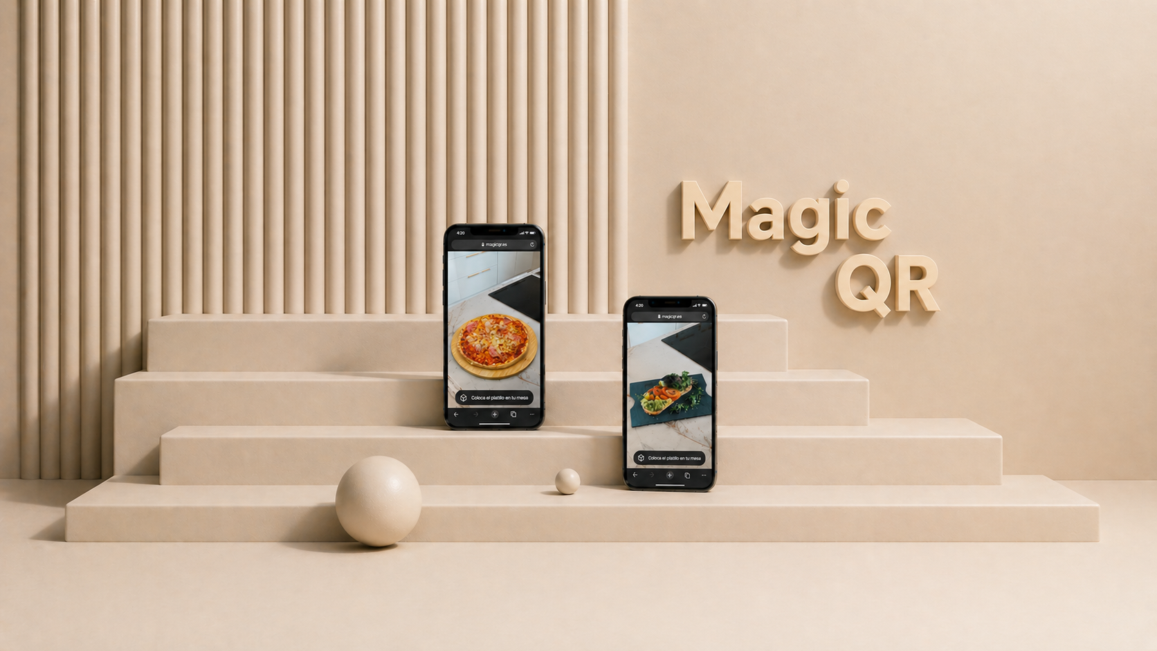 MagicQR convierte tus platos en experiencias de realidad aumentada 3D que el cliente comparte, repite y recomienda — solo con un QR o una carta digital en tu web.